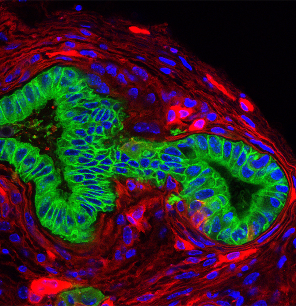 BU: Pankreaskarzinom (grün) in einer Mauslinie mit mutiertem Kras-Gen. In rot sind Zellen des Tumormikromilieus (Fibroblasten, Immunzellen, Endothelzellen) zu sehen.