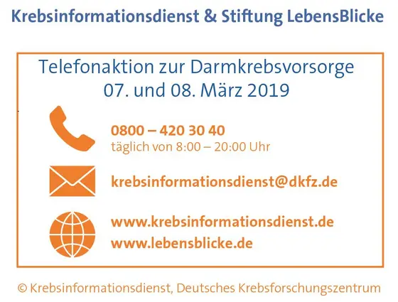 Je eher erkannt, desto besser kann Darmkrebs geheilt oder durch die Entfernung von Krebsvorstufen sogar vermieden werden. Nun stehen bei der gesetzlichen Krebsvorsorge Verbesserungen an: Künftig haben Männer fünf Jahre früher, also bereits ab 50 Jahren, Anspruch auf eine Darmspiegelung. Voraussichtlich ab Juli 2019 werden darüber hinaus Versicherte von den Krankenkassen schriftlich zur Darmkrebsfrüherkennung eingeladen. Ziel der Neuerungen: Mehr Menschen sollen die Angebote nutzen – um ihre Gesundheit zu erhalten. Im Rahmen einer bundesweiten Telefonaktion vom Krebsinformationsdienst des Deutschen Krebsforschungszentrums und der Stiftung LebensBlicke beantworten am 07 und 08. März 2019 Ärztinnen und Ärzte alle Fragen rund um das Thema Darmkrebs.
