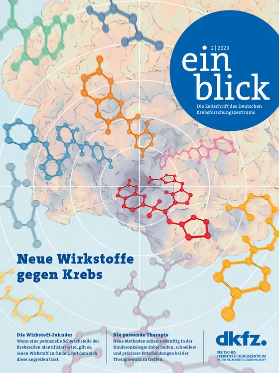 Gelingt es Forschern, eine Schwachstelle der Krebszellen aufzudecken, ist damit im Idealfall auch ein potenzielles Ziel für eine neue Therapie gefunden. Dann stellt sich als nächstes die Frage: Wie lässt sich dieses Ziel angreifen? Hier kommt eine Arbeitsgruppe des DKFZ ins Spiel, die sich auf die Suche nach geeigneten Wirkstoffen und deren Optimierung spezialisiert hat. Das Team vereint Fachwissen in unterschiedlichen Disziplinen und die nötige Erfahrung für das Feintuning der Moleküle. Denn der Weg zu einem neuen Wirkstoff ist anspruchsvoll. Mehr dazu und viele weitere Themen finden Sie in der neuen Ausgabe des einblick.