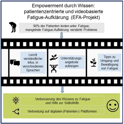 Ziel des EFA-Projekts war es, ein Video zu erstellen, dass Patient:innen über Fatigue informiert, ihnen Selbstmanagement-Tipps für den Umgang mit Fatigue aufzeigt und sie zur Nutzung von Unterstützungsangeboten ermutigt. Dafür arbeitete zwischen Februar 2025 und Oktober 2025 ein interdisziplinäres Projektteam aus Forscherinnen und Patientenvertreterinnen des NCT Patientenrats Heidelberg an der Erstellung eines animierten Videos, das Fatigue verständlich erklärt, Strategien zur Bewältigung vorstellt und geeignete Anlaufstellen aufzeigt. Das Projekt wurde durch das NCT-Programm “Spenden gegen Krebs" gefördert.