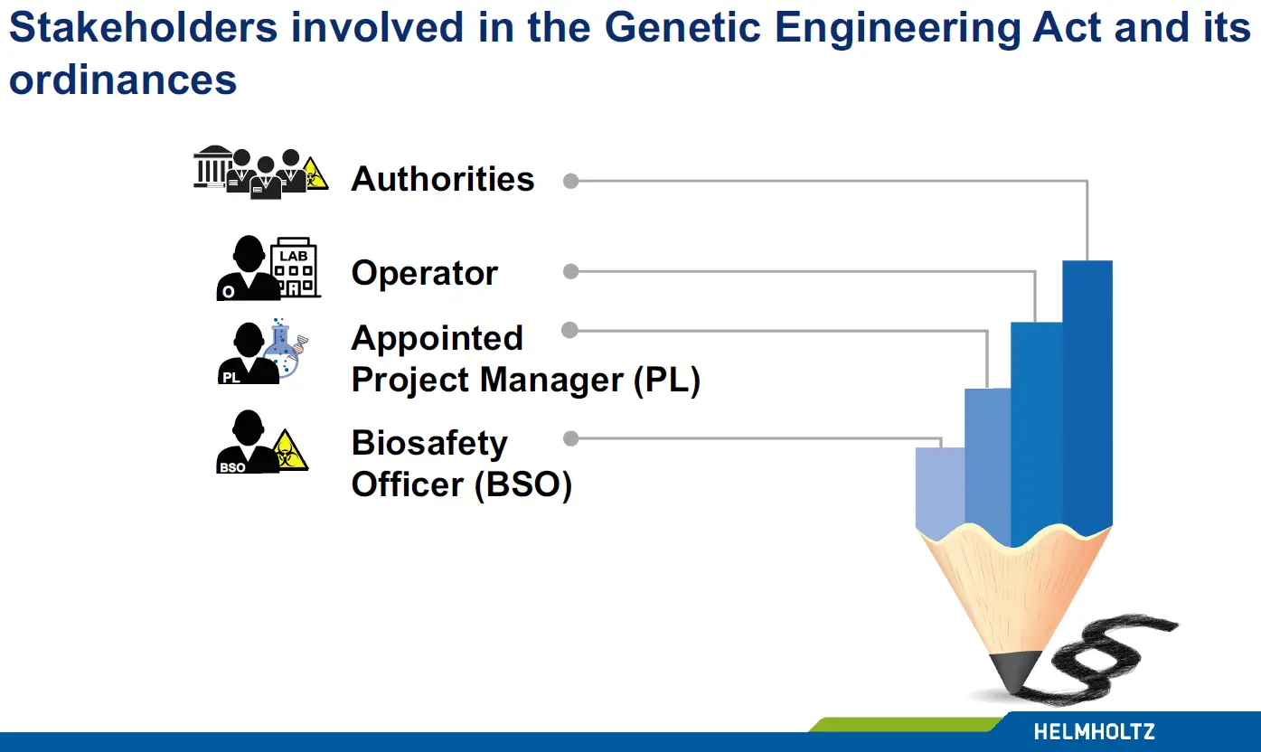 According to §§ 28 and 30 GenTSV, appointed project managers and biological safety officers must have verifiable knowledge and practical experience in handling microorganisms, plants or animals and the necessary knowledge of safety measures and occupational health and safety in genetic engineering work.