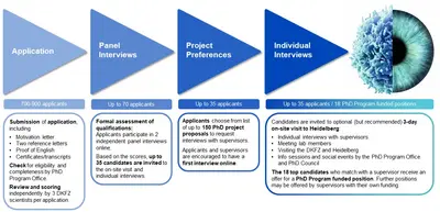 Shortlisted candidates will be invited to participate in one qualifying online panel interview. Following qualification in the panel interview, each recruiting supervisor will nominate three candidates for the on-site visit. These candidates will proceed to the final step of personal interviews with PhD project supervisors and will be invited to an on-site visit in Heidelberg. Further details about the selection process are provided below.