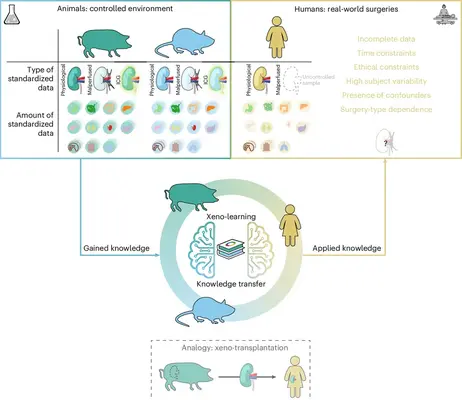 Main contribution: Limited human data, needed to train artificial intelligence (AI) models, has constrained the development of hyperspectral imaging (HSI) for surgical applications. We developed xeno-learning, an AI method that harnesses shared biological responses found across species, allowing experimental data from animals to be used in training AI models for HSI applications in humans.