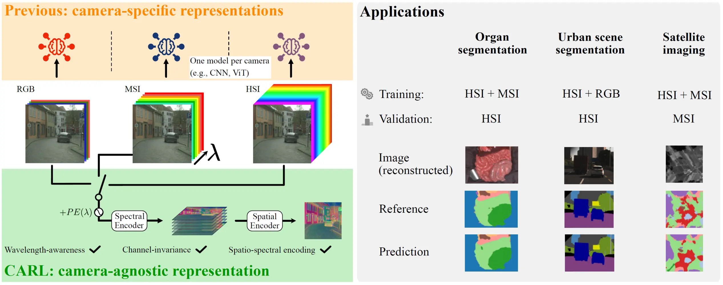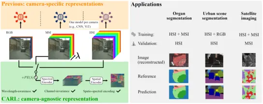 Baumann, A., Ayala, L., Seidlitz, S., Sellner, J., Studier-Fischer, A., Özdemir, B., Maier-Hein, L., & Ilic, S. (2026). CARL: Camera-Agnostic Representation Learning for Spectral Image Analysis. International Conference on Learning Representations (ICLR). [pdf]