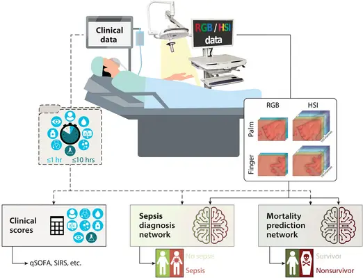 Main contribution: In a prospective observational study involving more than 480 intensive care unit patients, we show that deep learning-based hyperspectral imaging of the skin enables rapid and noninvasive prediction of sepsis and mortality and even outperforms widely used clinical biomarkers and scores when combined with readily available clinical data.