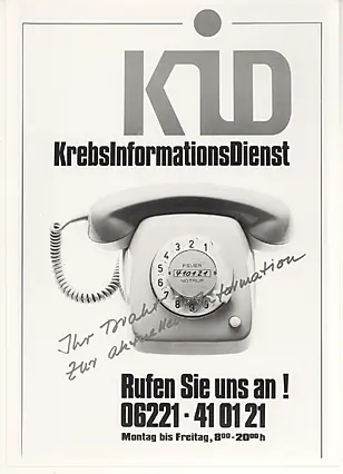 Started in 1986 as a telephone service operated by a few volunteers, the Cancer Information Service has long since evolved into a multimedia information service addressing many different target groups. As early as 1999, the Cancer Information Service added a comprehensive Internet presence to its service spectrum. Since 2001, it has been possible to send inquiries by e-mail. Finally, since 2006, cancer information has had one number: At the toll-free number 0800 420 30 40 the service is available seven days a week from 8 a.m. to 8 p.m.