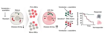 Beyond intensive and often highly toxic standard combination chemotherapies, treatment with the BCL-2 inhibitor venetoclax in combination with hypomethylating agents (e.g., 5-azacytidine) is currently transforming AML therapy and is expected to become a standard first-line treatment. We recently developed the MAC score, a personalized predictive biomarker system that enables stratification of AML patients according to their likelihood of response or resistance to venetoclax-based therapies.