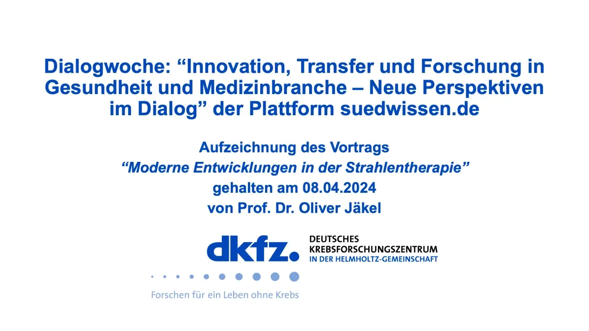 Die Aufzeichnung des Vortrags "Moderne Entwicklungen in der Strahlentherapie" ist online verfügbar. Der Vortrag wurde von Prof. Dr. Oliver Jäkel (Leiter unserer Abteilung) am 08.04.2024 im Rahmen der Dialogwoche: "Innovation, Transfer und Forschung in Gesundheit und Medizinbranche – Neue Perspektiven im Dialog" der Weiterbildungsplattform suedwissen.de live über Zoom gehalten.