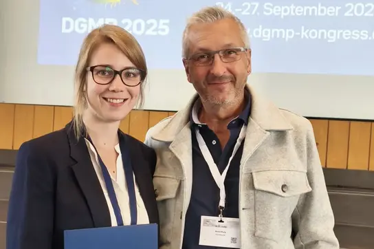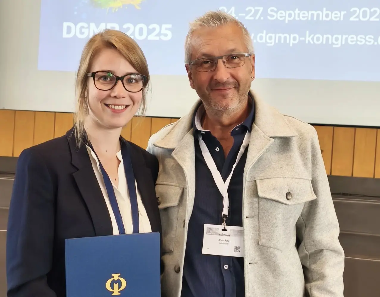 Wir freuen uns sehr, dass Dr. Christina Stengl den 1. Behnken-Berger-Preis 2025 der Behnken-Berger-Stiftung erhalten hat. Damit wird ihre wissenschaftliche Arbeit zum präklinischen Einsatz von Mini-Beam-Bestrahlungen mit Kohlenstoff-Ionen zur Verbesserung der Behandlung von Pankreaskarzinomen ausgezeichnet, die sie im Rahmen ihrer Dissertation in unserer Abteilung in der Arbeitgruppe “Medizintechnik” (Leitung: Armin Runz) anfertigte. Der Preis wurde auf der Jahrestagung der Deutschen Gesellschaft für Medizinphysik (DGMP) in Berlin verliehen.