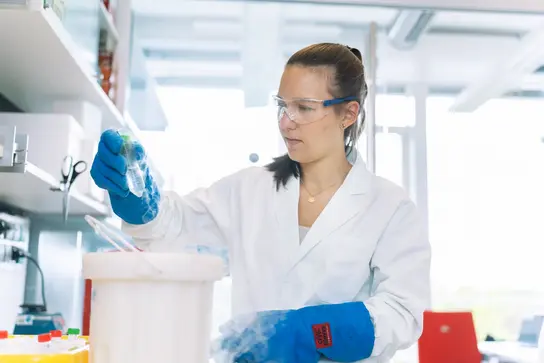 Eine lächelnde Frau in einem weißen Laborkittel steht in einem Labor. Im Hintergrund sind einige Laborausrüstungen und Regale sichtbar. Die Frau vermittelt Professionalität und Freundlichkeit.
